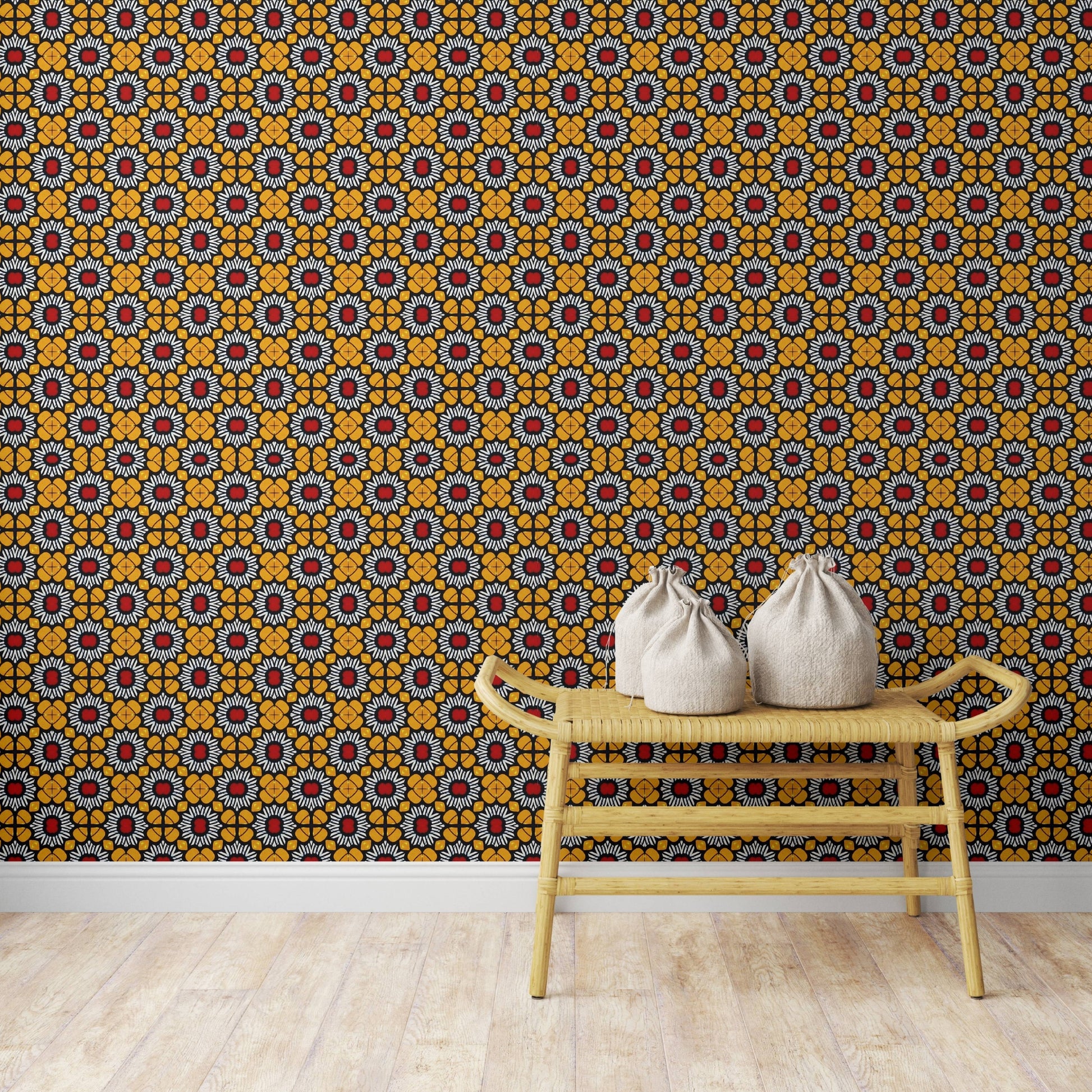 The Solaris Collection features bold geometric patterns inspired by traditional African design. With warm golden yellows, deep navy, and rich terra cotta, these wallpapers bring African artistry into contemporary spaces. The repeating sunburst motifs and interconnected shapes create rhythm and movement across your walls while honouring the mathematical precision found in historical African textile traditions. These designs work well in living spaces and entryways, creating distinctive focal points that spark conversation. Printed on durable wallpaper for everyday practicality.